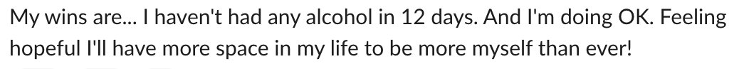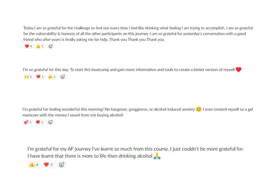 There is no shame, guilt, or blame included in this program. It’s about your PROGRESS and growth. Drinking again is just a learning opportunity. When you see it that way, you start to get curious about it instead of feeling shameful. We go over how to get back up again, how to get the momentum to commit to your best ability, and we tackle mindset blocks every single week.