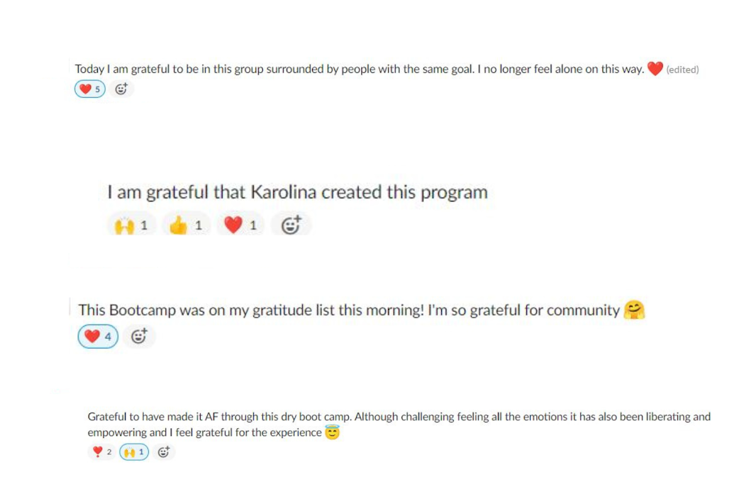 Dry Bootcamp is a highly immersive community experience to take a 22 day break from alcohol and take care of your emotional needs in new healthy ways, run by bestselling author, Karolina Rzadkowolska.