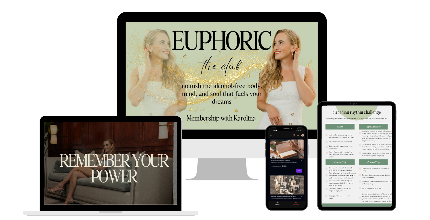 By joining Dry Bootcamp, you'll automatically receive a 89% discount on your first month of Euphoric the Club, the space for successful women who don't drink and the women who are becoming them and unlock all my signature courses + coaching + trainings.